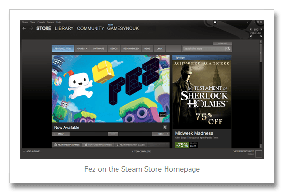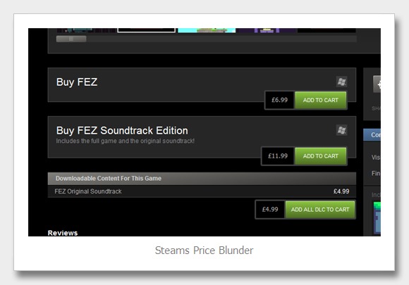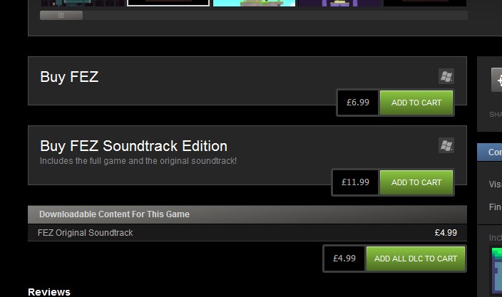 (In case you can’t see the image: FEZ: £6.99/FEZ Soundtrack Bundle: £11.99/FEZ Soundtrack: £4.99)